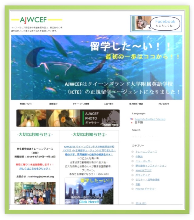 2015年10月12日更新 *2015年8月野生動物保護トレーニングコースの感想文がAJWCEF NEWS スタディツアー&トレーニングコース体験談のページからご覧になれるようになりました。 http://www.ajwcef.org/ajwcef-news.htm
